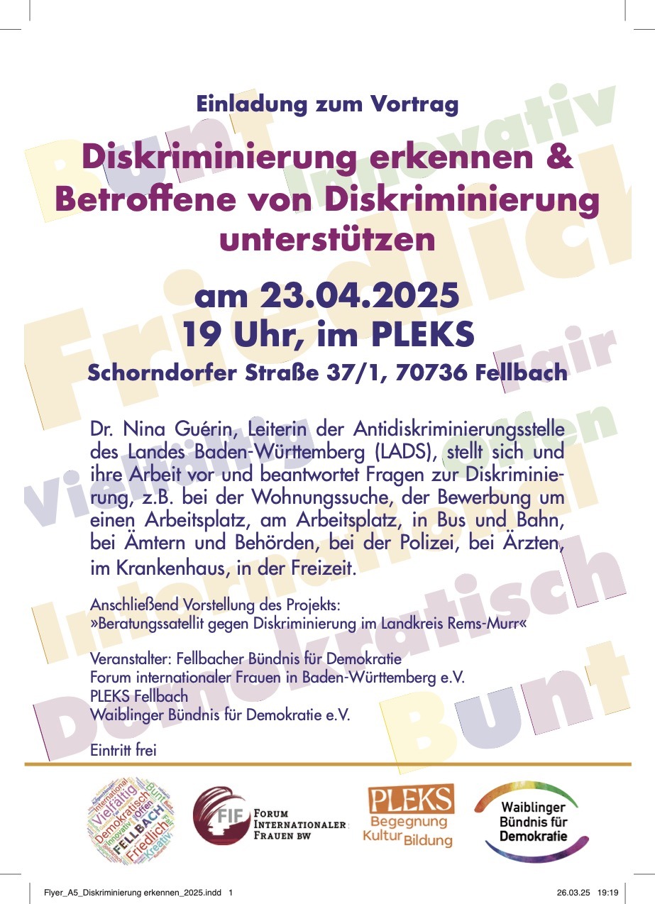 Dr. Nina Guérin, Leiterin der Antidiskriminierungsstelle des Landes Baden-Württemberg (LADS), stellt sich und ihre Arbeit vor und beantwortet Fragen zur Diskriminierung, z.B. bei der Wohnungssuche, der Bewerbung um einen Arbeitsplatz, am Arbeitsplatz, in Bus und Bahn, bei Ämtern und Behörden, bei der Polizei, bei Ärzten, im Krankenhaus, in der Freizeit.